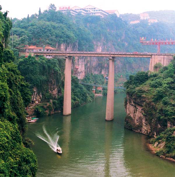 宜昌下牢溪大桥位于风光秀丽的宜昌三游洞风景区。该桥飞跨陡崖,拔地而起,椭圆型墩柱高达63米,1972年建成
