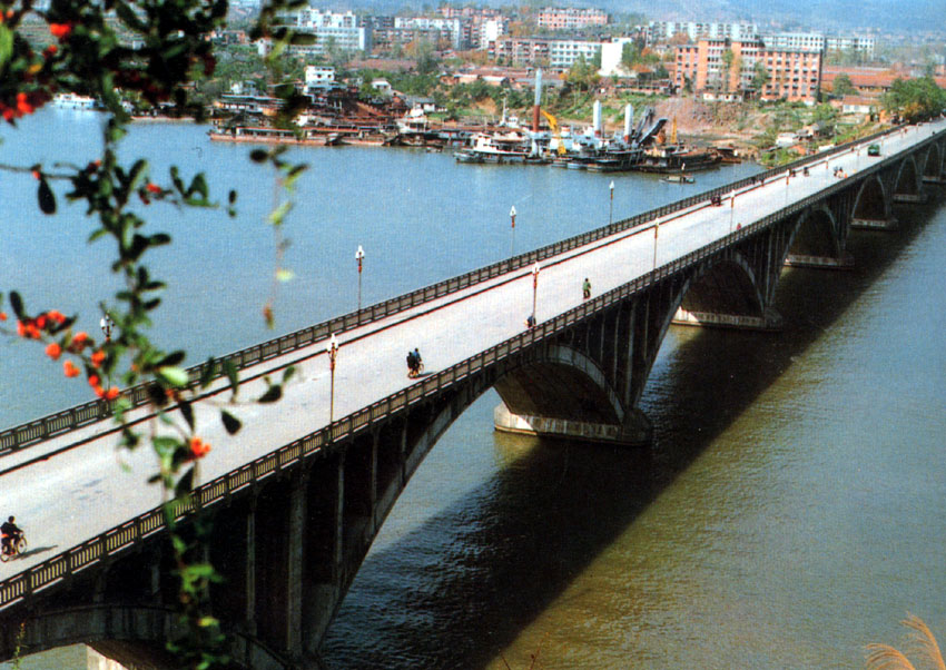 黄柏河大桥是长江葛洲坝水利枢纽的配套项目。全长476.95米,7孔跨径60米钢筋混凝土肋型拱,1981年建成,获得国家和省优质工程奖。