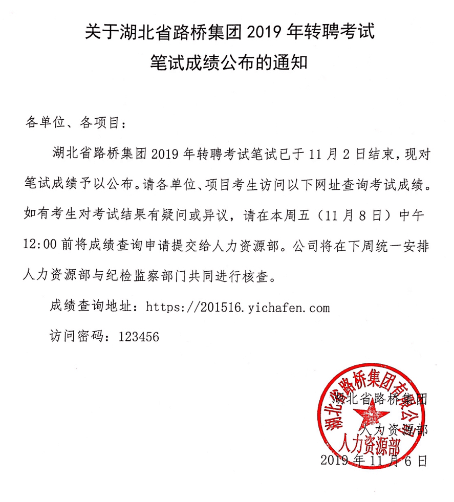 关于湖北省路桥集团2019年转聘考试笔试成绩公布的通知