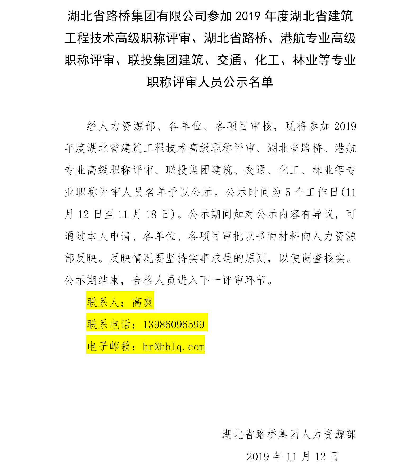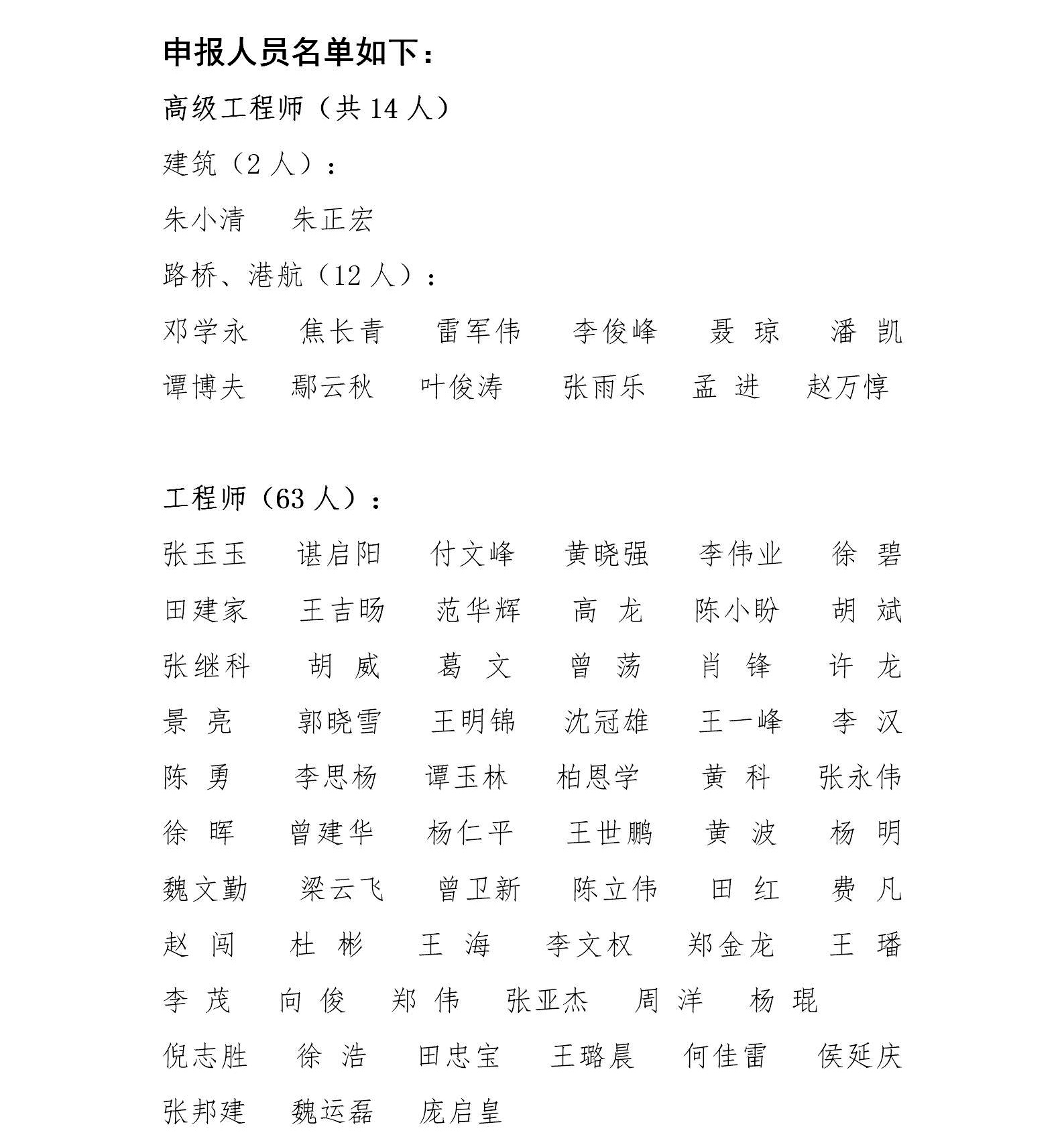 华体会平台参加2019年度湖北省建筑工程技术高级职称评审、湖北省路桥、港航专业高级职称评审、联投集团建筑、交通、化工、林业等专业职称评审人员公示名单