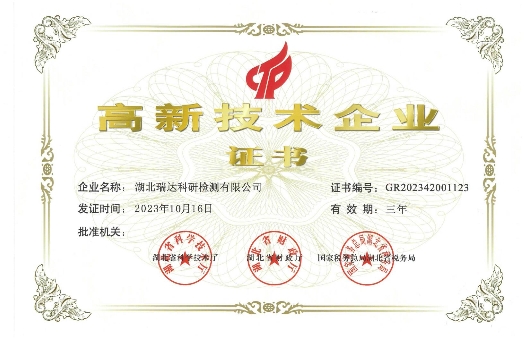近日,湖北路桥瑞达检测公司收到由湖北省科学技术厅、湖北省财政厅、国家税务总局湖北省税务局共同颁发的“高新技术企业”证书,这是瑞达检测公司首次荣获此项认定,标志着瑞达检测公司在科技创新和产业升级方面取得了重要突破,正式迈入国家高新技术企业行列。