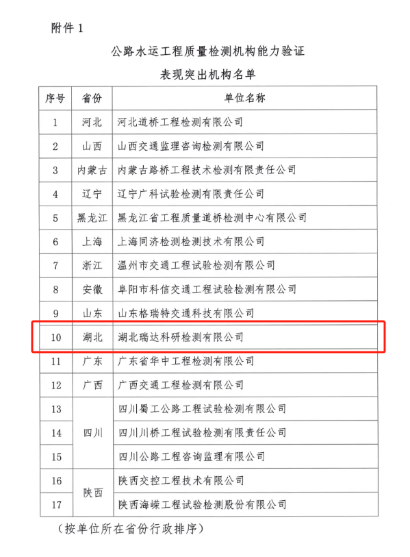 近日,中国交通建设监理协会发布《关于表扬在公路水运工程质量检测能力验证活动中表现突出机构和人员的通知》,湖北路桥旗下的瑞达检测公司荣获“表现突出机构”称号,且是湖北省内唯一获得表彰的检测单位。