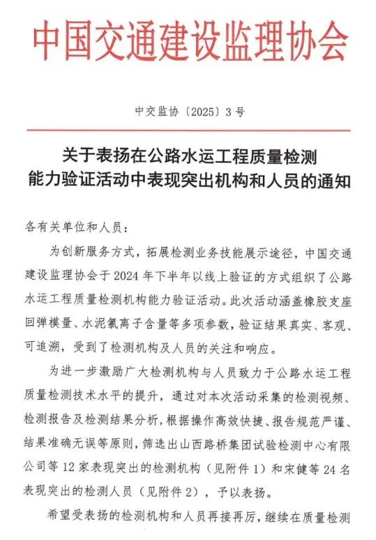 1月9日,中国交通建设监理协会发布表彰通知,瑞达科研检测公司成功蝉联第二届公路水运工程质量检测能力验证“表现突出机构” 荣誉,是全省唯一一家连续两届获此荣誉的检测机构。