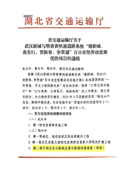 近日,湖北省交通运输厅发布两则关于武汉新城与鄂黄黄快速道路系统建设的通报,由湖北路桥承建的吴楚大道项目、高新八路一期项目分别获评年度“红旗”项目、百日攻坚劳动竞赛优胜项目。