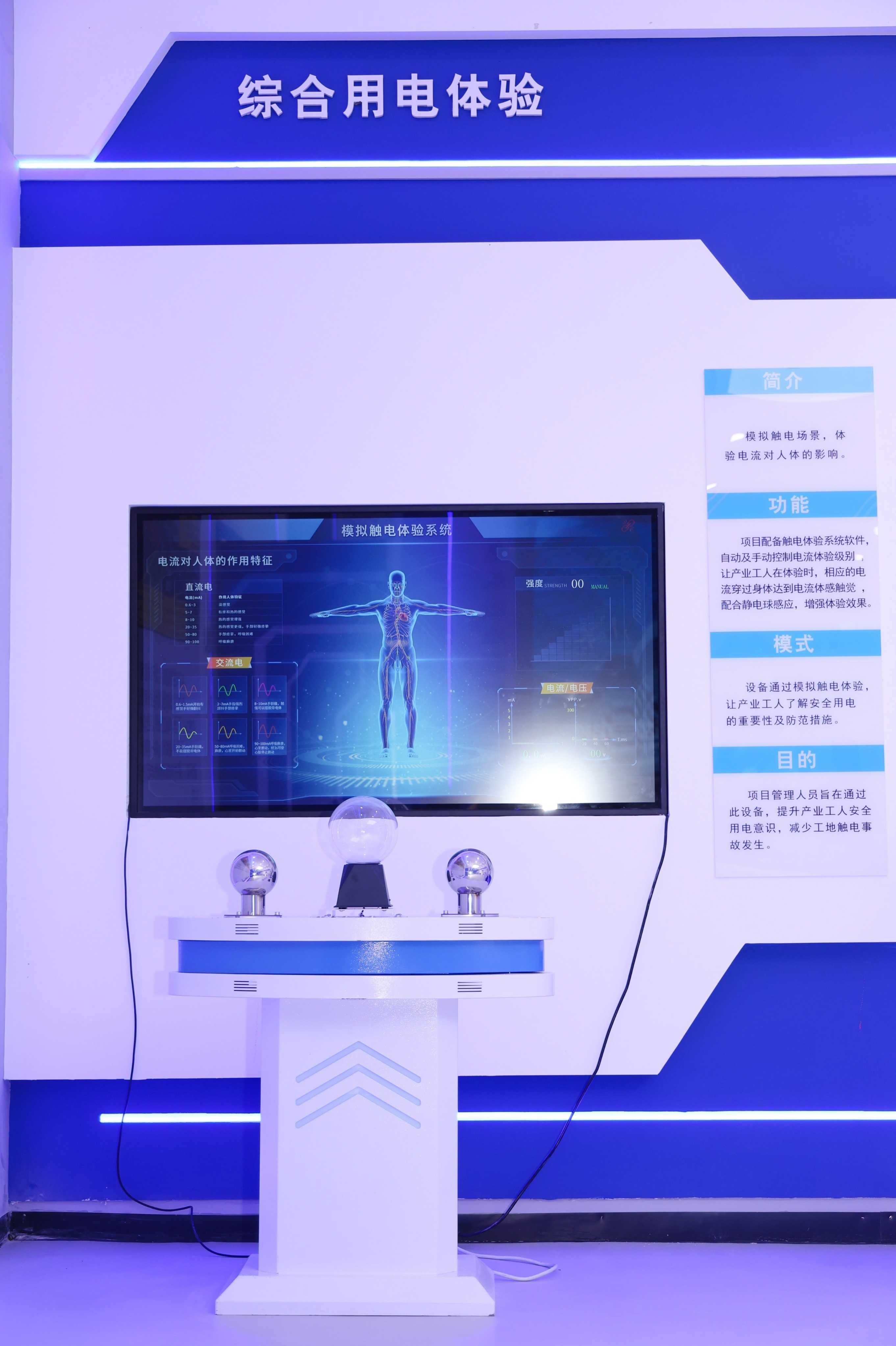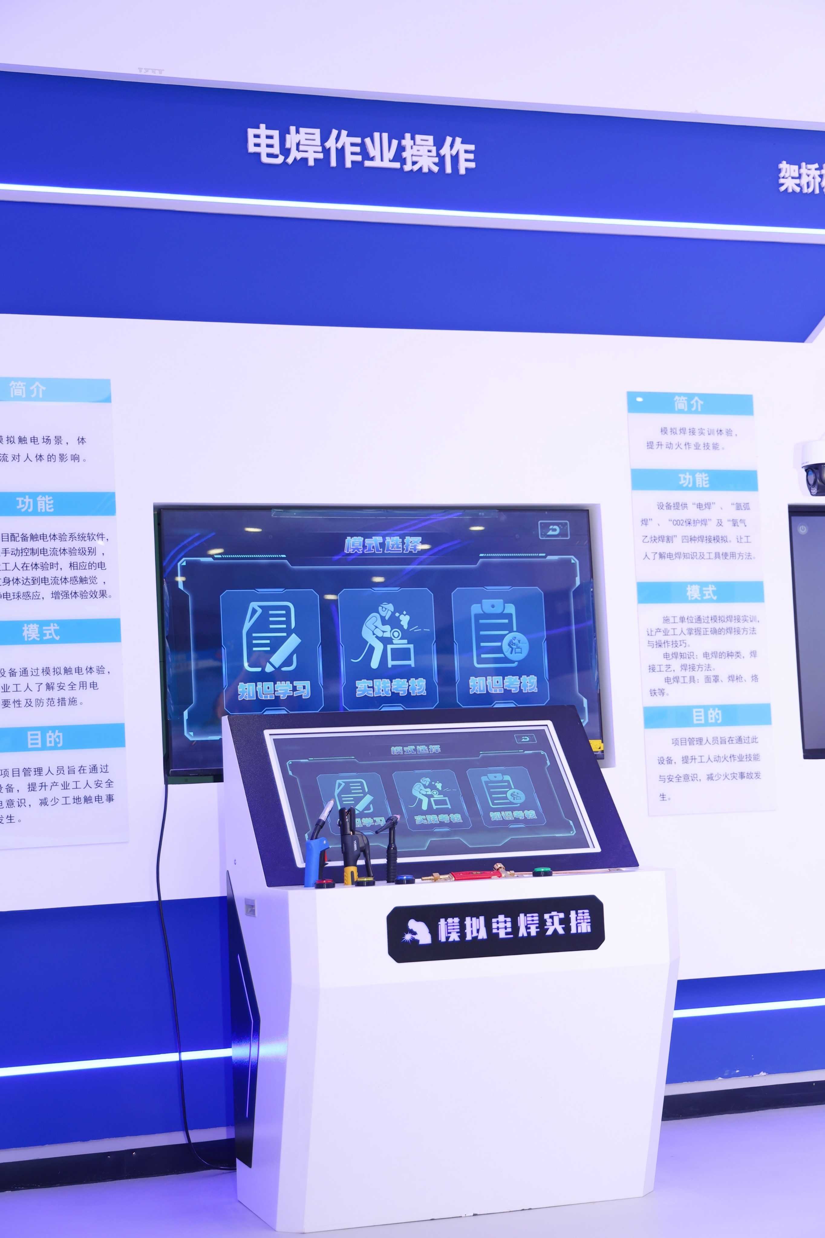 走进智慧馆,兼具科技感与实用性的场景令人印象深刻:线上管理平台实时滚动着工人培训记录,线下移动终端可在施工现场随时开展“微课堂”;在VR虚拟体验区,工人戴上设备就能“亲历”高空坠落、机械碰撞等高危场景,在痛感与震感中强化安全意识;在综合用电体验区,真实电流通过模拟装置产生的酥麻感,让安全用电从理论变成了切身体会。